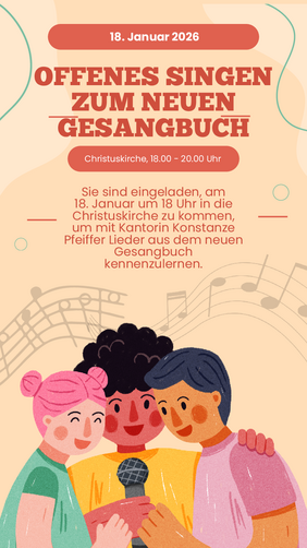 Am Sonntag, den 18.1. findet von 18 – 19.30 Uhr ein Offenes Singen mit Kantorin Konstanze Pfeiffer in der Christuskirche. Im Fokus steht das neue Gesangbuch, dass im Jahr 2028 neu erscheint. Aus einem Probeband gibt Konstanze Pfeiffer einen Überblick über alles neue und es werden gemeinsam neue Lieder entdeckt. Alle, die Lust haben die eigene Stimme zu entdecken und gemeinsam mit anderen singen möchten sind herzlich eingeladen vorbeizukommen. Vorerfahrung ist nicht notwendig.